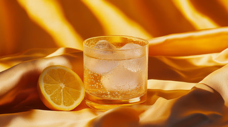 A refreshing glass of ice water with a slice of lemon, set against a soft yellow fabric backdrop. The vibrant colors create a warm, inviting atmosphere.