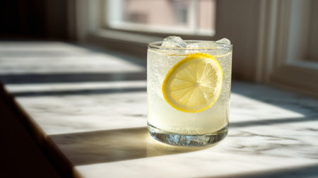 A refreshing lemon soda drink served over ice in a clear glass, beautifully illuminated by sunlight filtering through a window, perfect for casual enjoyment.