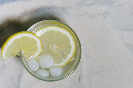 Lemon soda with ice and honey in a glass, top-down view, perfect summer drink, cool and sweet