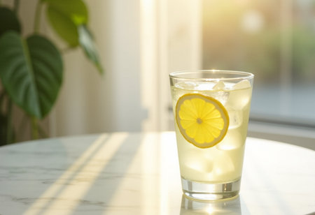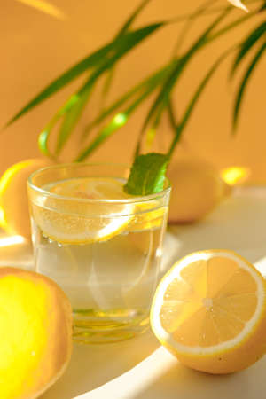 A transparent glass with a slice of lemon and ice on the background of sunlight. Refreshing summer cocktail healthy.