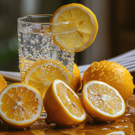 A refreshing glass of sparkling lemonade with lemon slices rests on a wooden table alongside halved lemons, highlighting summer vibes.