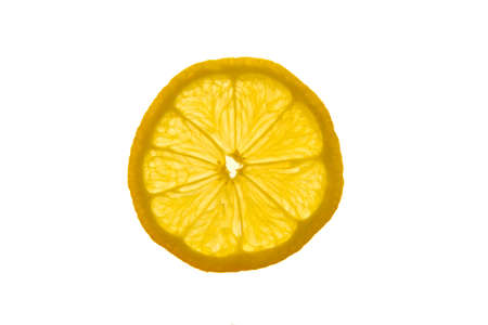 Translucent slice of a yellow lemon on a white background.