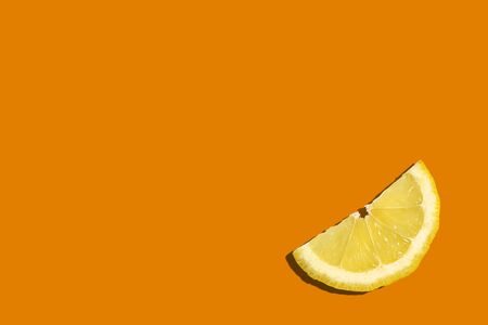 Lemon slice on orange background with copy space top view