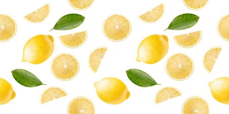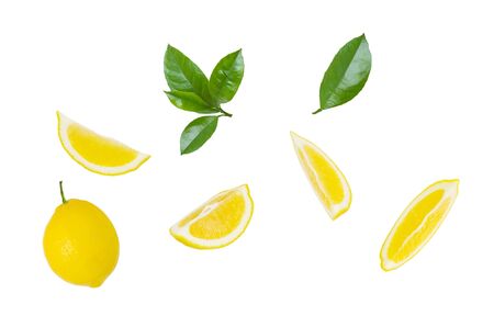 Lemon fruit, slices and green leaves isolated on white background