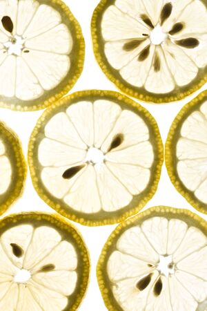 Yellow lemon slices on white background