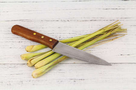Fresh lemongrass with a sharp knife over wooden background