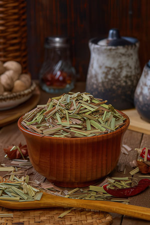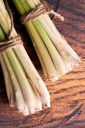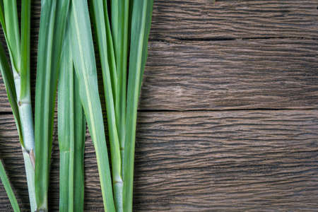 fresh lemon grass is herb on wood background