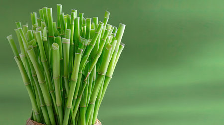 A stunning display of fresh green bamboo sticks arranged beautifully against a soft green background, evoking tranquility and a sense of nature. Ideal for decor.