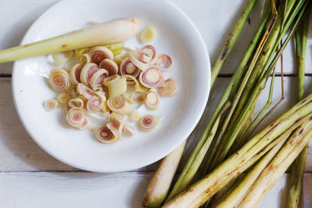 Freshly cut lemongrass on white plate on white wooden table