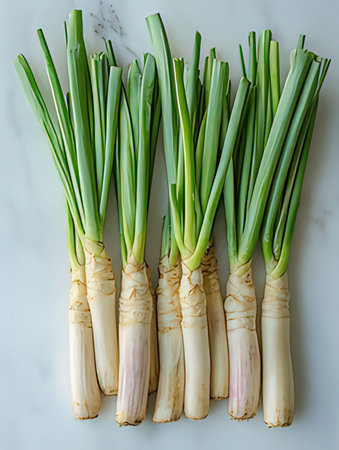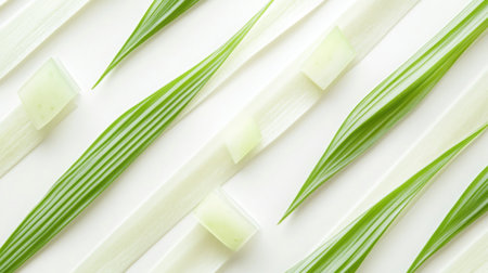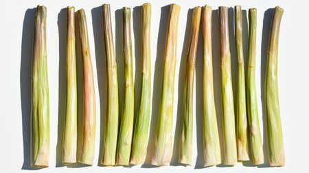 This image showcases fresh lemongrass stalks arranged neatly on a white background, highlighting their vibrant green color and texture. Perfect for culinary uses.