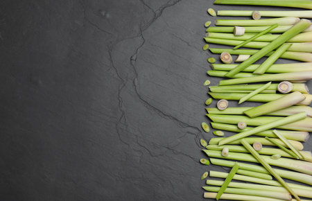 Fresh lemongrass stalks on black table, flat lay. Space for text
