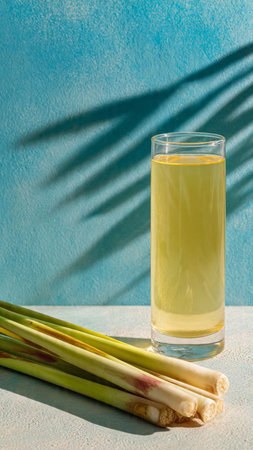 lemon grass juice in a glass and lemongrass on a blue background