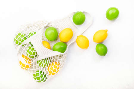 Organic lemons and limes in reusable eco-friendly string mesh bag. Zero waste, plastic free and sustainable lifestyle concept. White kitchen table background, copy space, top view