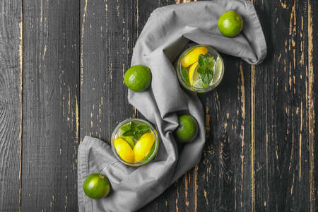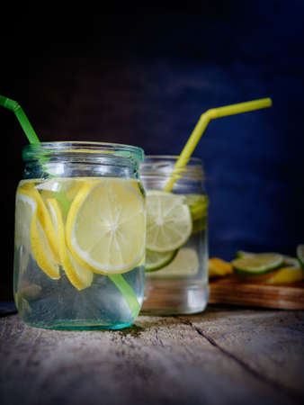 detox water with a lemon, lime and mint on a wooden table
