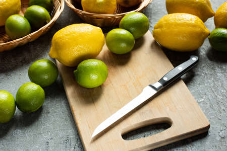 ripe yellow lemons and limes on wooden cutting board with knife on concrete textured surface