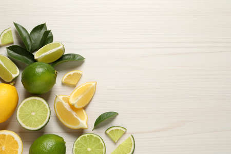 Fresh ripe lemons, limes and green leaves on white wooden background, flat lay. Space for text