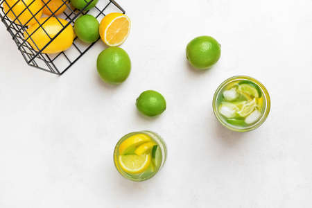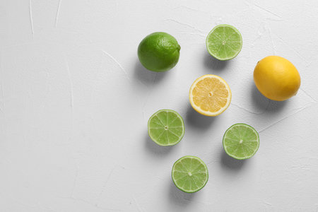 Fresh lemon, lime, green leaves on light background, top view. Citrus Juice Concept, Vitamin C, Fruits.