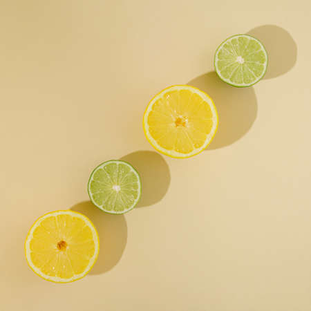 fresh summer fruit with lemon and lime on sandy background.flat lay minimal yellow green idea