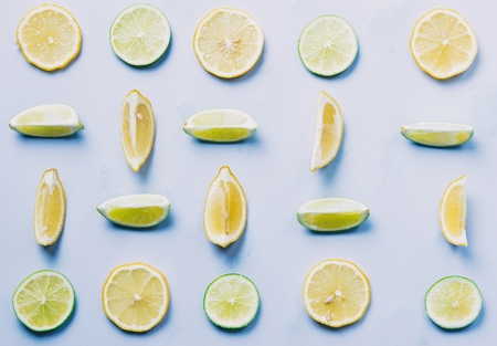 Slices of fresh lime and lemon on a blue background with water drops. Citrus background.