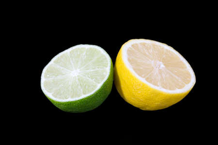 Citrus fruits of yellow lemon and green lime; whole and half; isolated on black background; close up