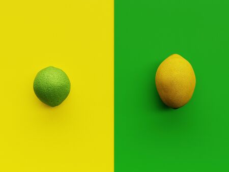 Yellow Lemon and green lime viewed from above with vibrant yellow and green backgrounds in minimalism flatlay with copyspace - 3d rendering concept