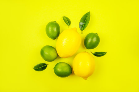 Bright summer citrus flatlay with lemons and limes isolated on yellow background.