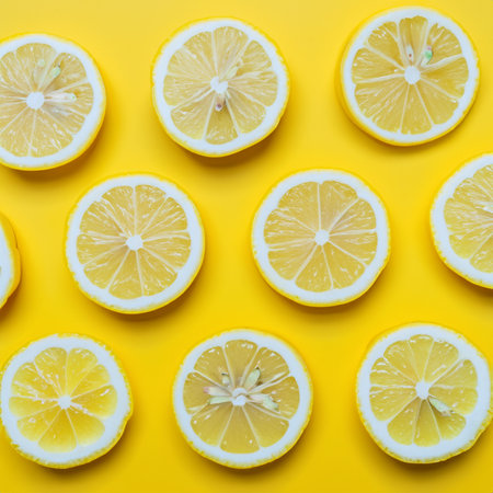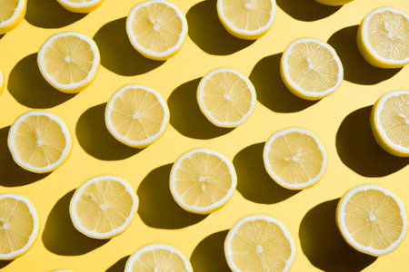 Lemon halves arranged in geometric pattern on vibrant yellow background. Fresh citrus fruit concept with modern abstract design style.