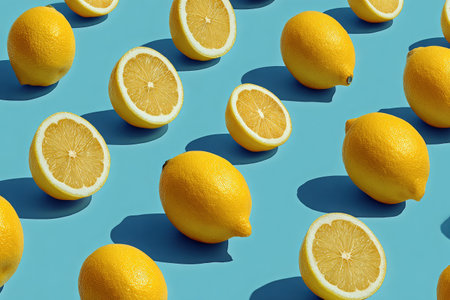 Bright yellow lemons are artistically arranged on a blue background, highlighting their textures and shadows, creating a vibrant and refreshing atmosphere