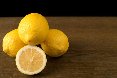 Food shot. Lemons Appetizing lemons, wooden board on a dark background.