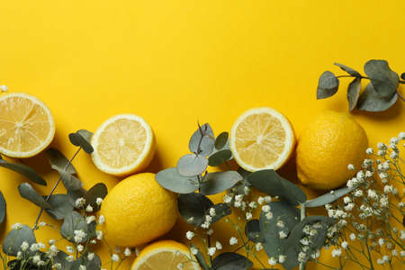 Eucalyptus branches, lemons and gypsophila on yellow background