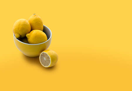 Bowl full with lemons on yellow backgound with copy space