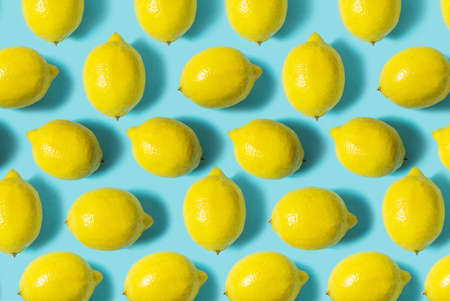 Creative summer food minimalistic background with raw ripe yellow bright lemons laid out in pattern on blue pastel surface. Copy space for ad. Studio shot with soft light