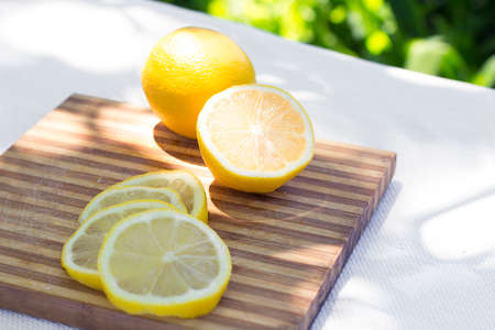 Fresh lemon slices on a cutting board jn natural background.