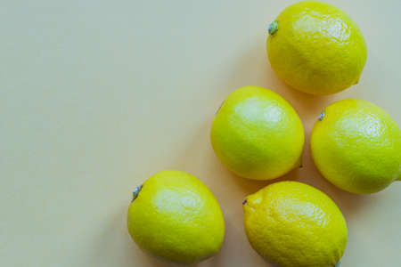 Ripe lemons on the yellow wooden surface, top view. Vibrant background