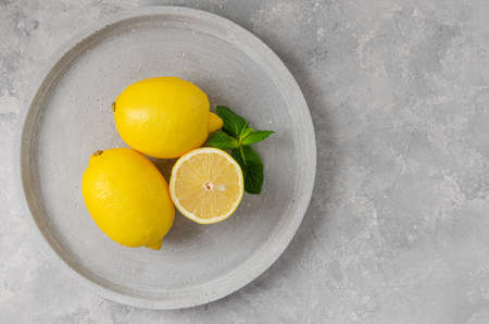Fresh yellow lemons on a gray concrete background. The color of the year. Food background. Copy space