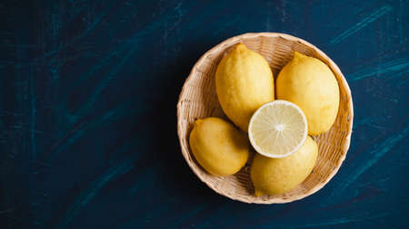 Fresh yellow lemons on an old blue background. Design concept. Selective focus.