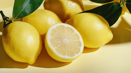 A vibrant arrangement of fresh yellow lemons with green leaves, showcasing natural beauty on a soft yellow backdrop. Perfect for culinary or health themes.