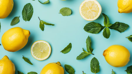 Fresh yellow lemons with mints on pastel background. summer background flat lay from above. citrus food composition. By generative Ai