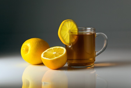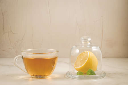 tea with a lemon and leaves of mint/tea with a lemon and leaves of mint on a white background. Selective focus
