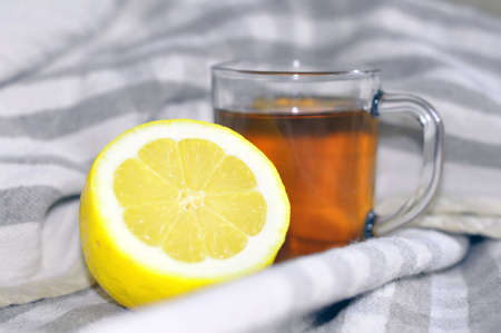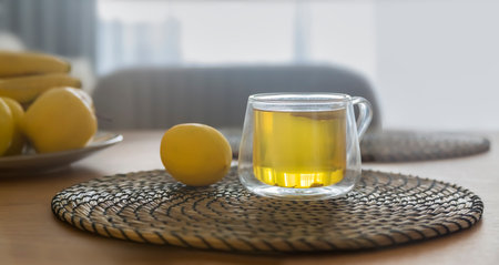 A glass cup of tea with lemon on a serving straw napkin on the table against a defocused background of windows in the dim morning light