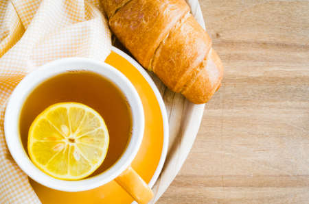 Morning breakfast with fresh croissants and cup of tea with lemon on a wooden table in orange color.