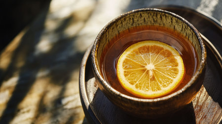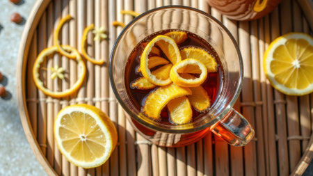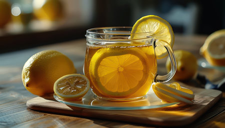 Glass mug of herbal tea with lemon slices on bamboo tray in sunlight. That the image is generated using AI.