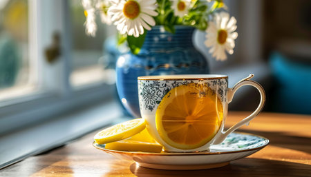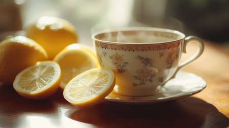 A small, delicate teacup resting on a saucer with lemon slices, creating a refreshing and elegant tea scene