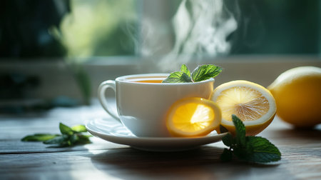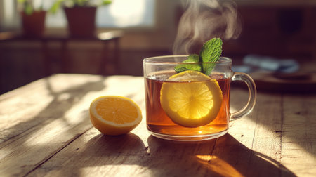 Warm and comforting scene of a steaming lemon tea with mint, bathed in sunlight on a wooden table.
