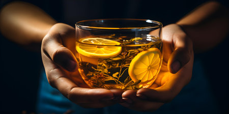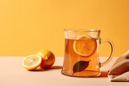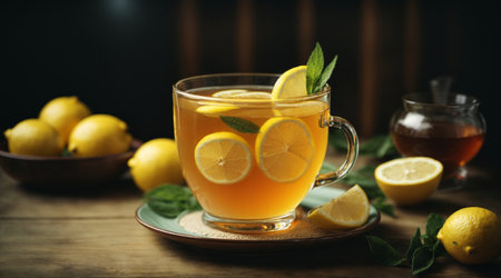 relaxing tea time, relax with a refreshing lemon tea in a transparent cup, perfect for unwinding at the end of a busy day