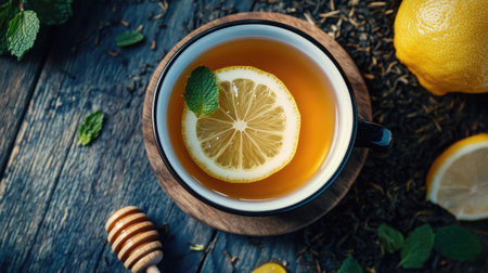 Top view of a cup of herbal tea with a lemon slice and fresh mint leaves, placed on a wooden table with scattered tea leaves and a honey dipper beside it.