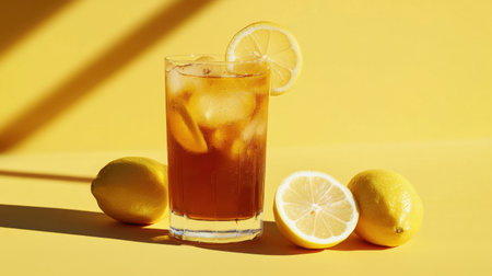 A refreshing glass of cold iced tea with lemon slices on the rim, placed on a vibrant yellow background with a few whole lemons beside it.