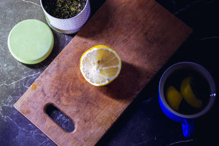 Top view, a cup of tea with lemon, a half of lemon and one pill on wooden background, copyspace.