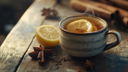 A warm cup of herbal tea with lemon and spices, set on a rustic wooden table in a cozy kitchen.