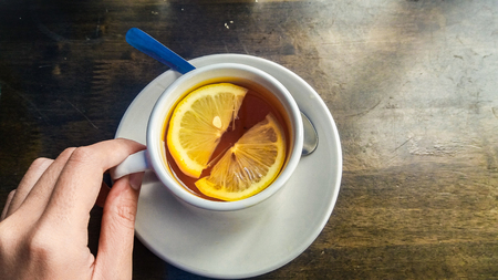 woman hands close-up holding fresh cup of warm tea with lemon wearing sweater
